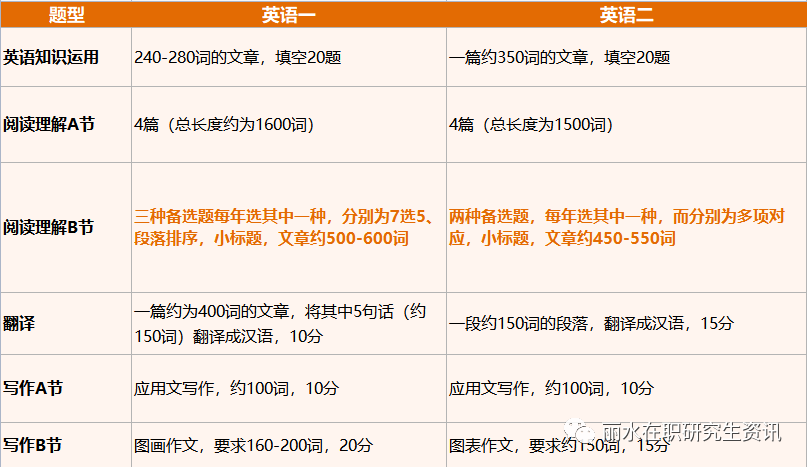 考試形式相同:筆試閉卷,滿分100分,考試時間為180分鐘,英語一各個板塊的試卷難度都大于英語二。