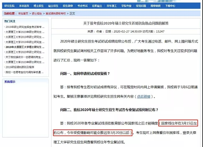 太原理工大學(xué)在研究生招生信息網(wǎng)上公布,原定于3月15日公布國(guó)家線,有望推遲至3月20日公布。